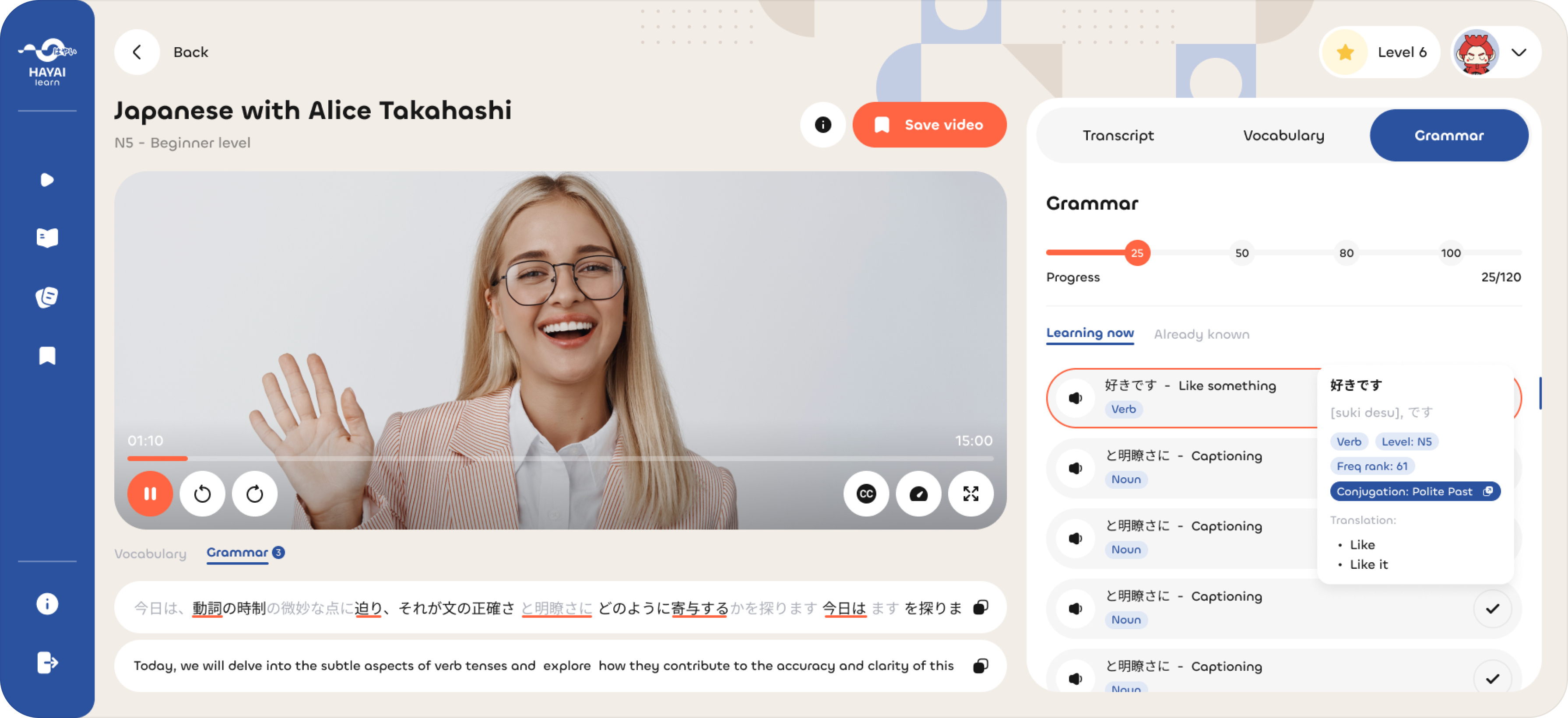 The fun and sustainable way to learn Japanese by watching your favorite Youtubers, TV shows, animes, music, games. Designed for effortlessly acquiring new vocabulary and grammar.